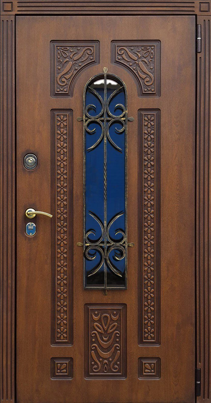 Входные двери в Сольцах с применением декора витражом изготавливаются из стального профиля, придающего прочность конструкции, а сама витражная вставка обладает высокой взломостойкостью, поскольку для витражных композиций используется специальное стекло, обработанное особым образом. Усилить надежность витражного элемента можно с помощью использования декоративных кованных решеток.